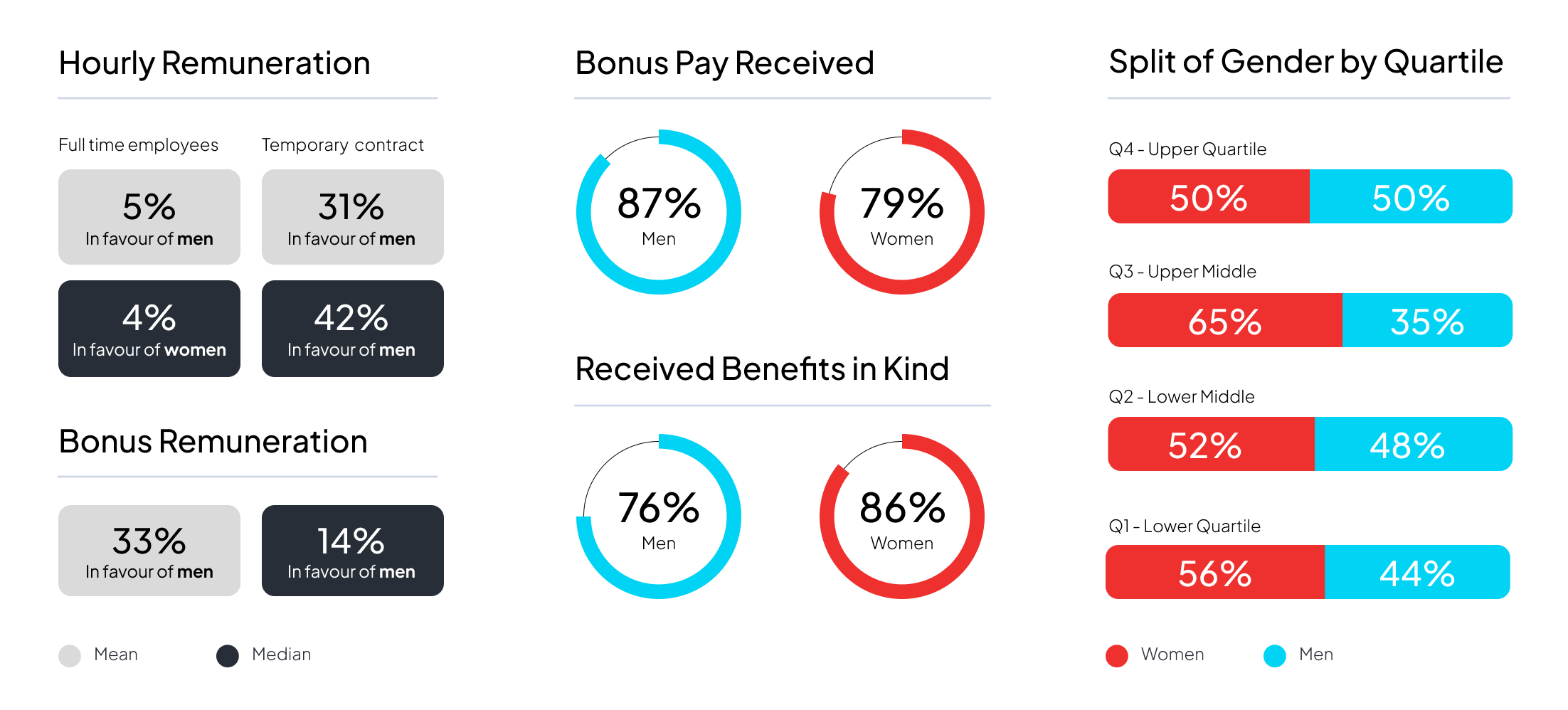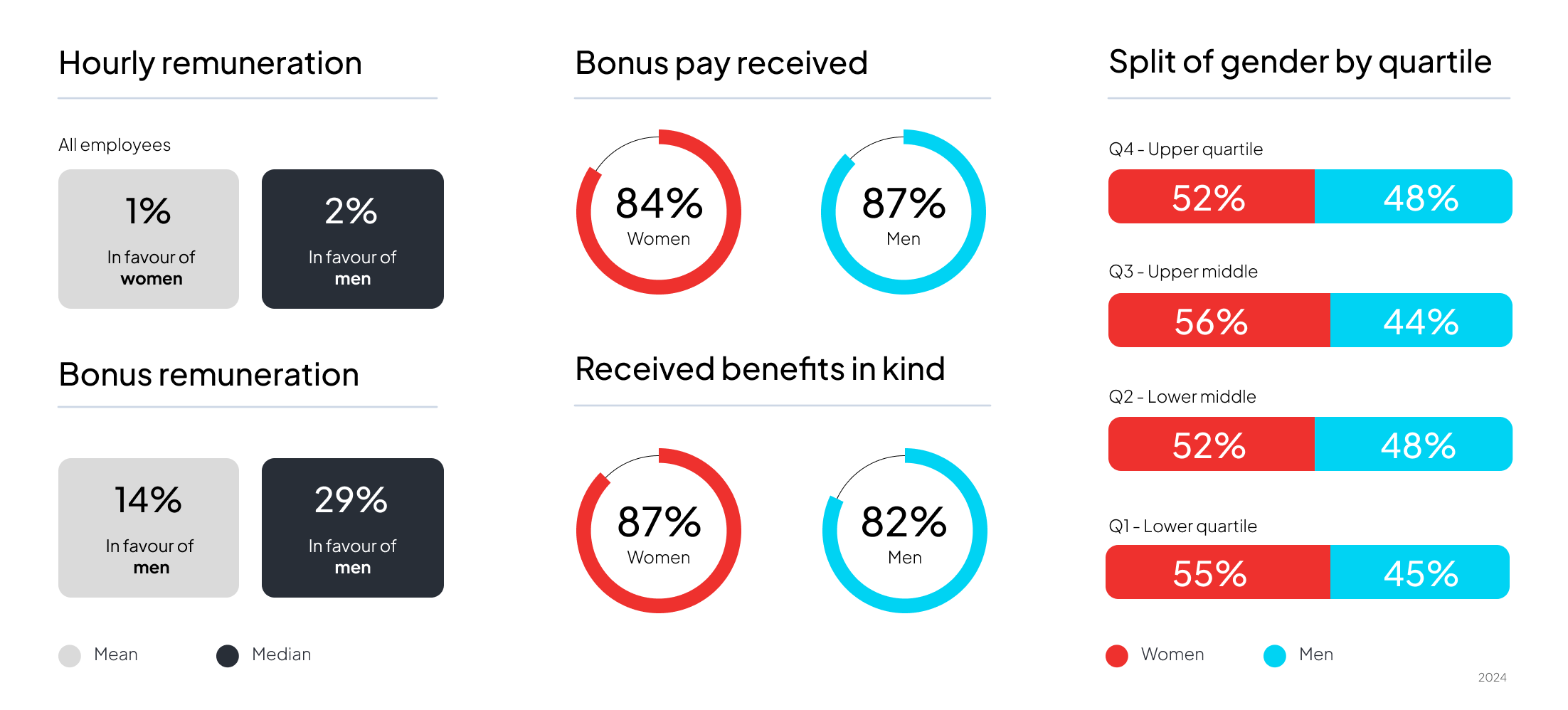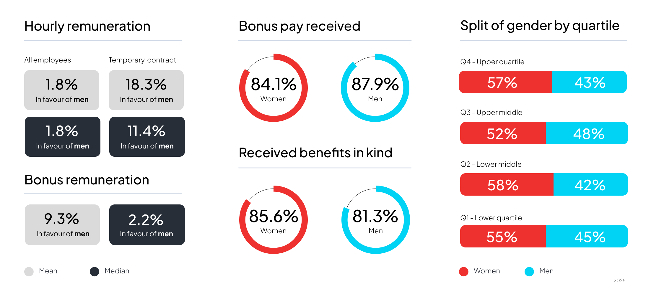 We report on mean and median data, in accordance with local requirements. Mean data is calculated by adding up all the numbers in a sample and dividing by the number in that sample.Median data is calculated by ranging the numbers in order from the lowest paid to the highest paid, and the middle number is the median.