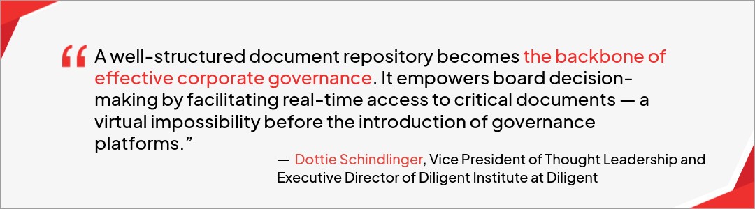 - Corporate Secretary: The corporate secretary and other board administrators use document repositories to manage board materials, promote compliance with regulatory requirements and securely distribute documents to board members. Repositories can also simplify record-keeping and governance-related documentation.