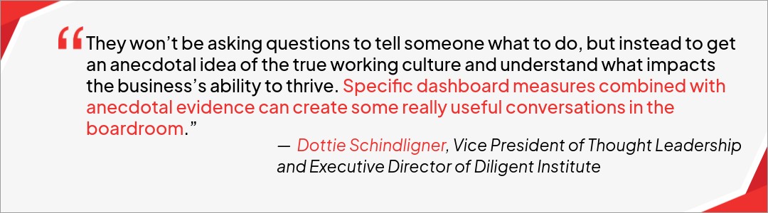 Nowadays boards can get data on lots of things, but Schindlinger advises boards to remember exactly what it is your company is trying to accomplish: “As a researcher, we tend to fall into the trap of if we can measure it, then it must be important. It’s not always true. We live in an era of great volatility, uncertainty, complexity, and ambiguity. The right approach is to figure out the range of things that might derail the organization, and the probability of them happening along with the severity of impact if they do. These are the areas you focus on.”