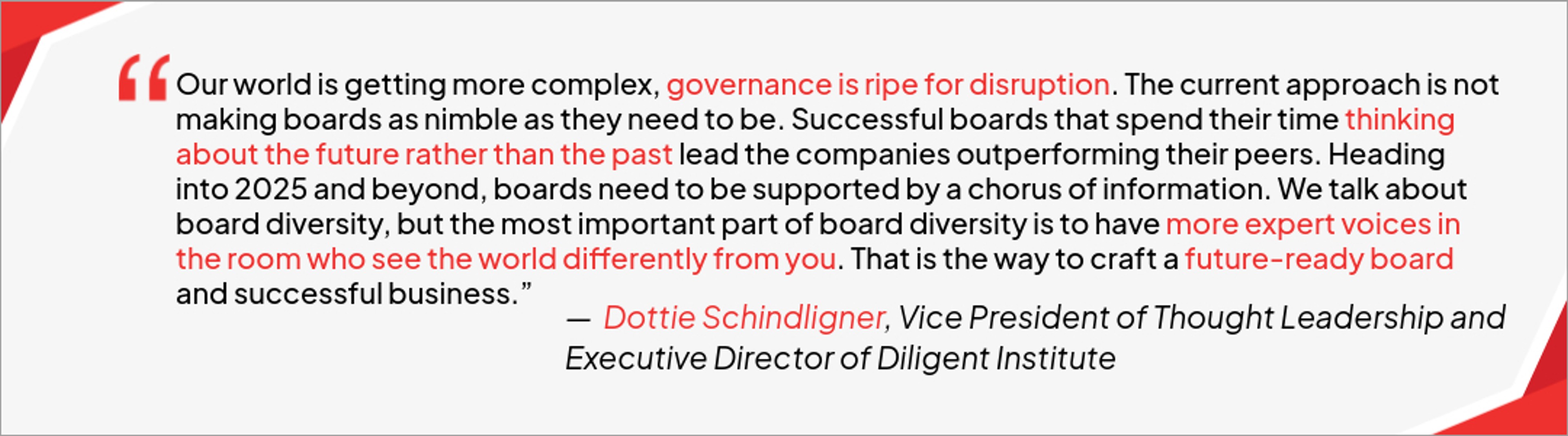 Although there are many daunting risks approaching boards in the coming year, the opportunities can be huge. For future-thinking boards governance is ripe for disruption and a renewed sense of direction. Schindlinger concludes with one last piece of advice “Get better dashboards” — dashboards are essential to the solution of monitoring real-time risk, something that will prove invaluable to boards as they navigate through the unpredictable nature of 2025.