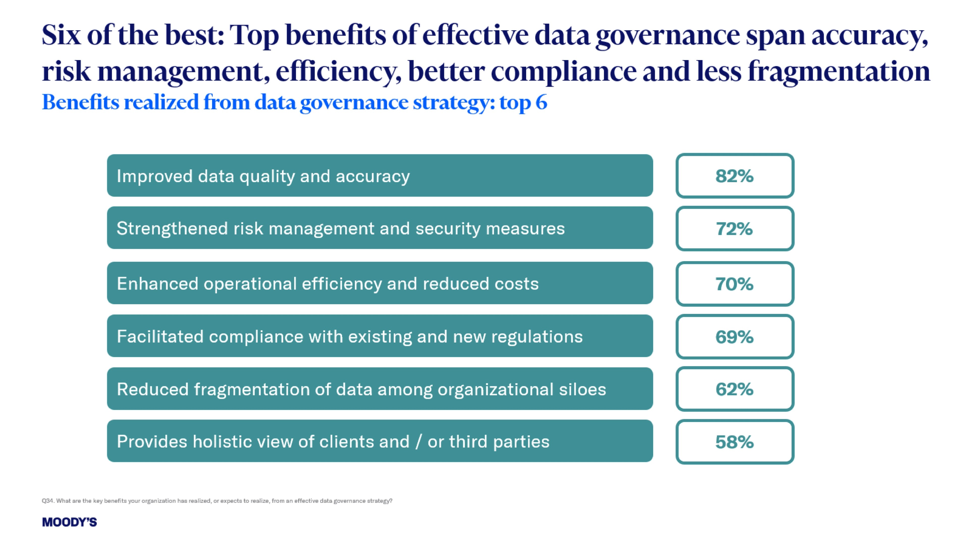 To enhance company reference data management, organizations can adopt several strategies. Technology plays a crucial role in improving data quality and accessibility. Data integration platforms, cloud storage solutions, and advanced data analytics tools can help organizations manage their reference data more effectively. Moody’s entity verification study also highlighted the benefits that the market have already realized from robust data governance strategies: