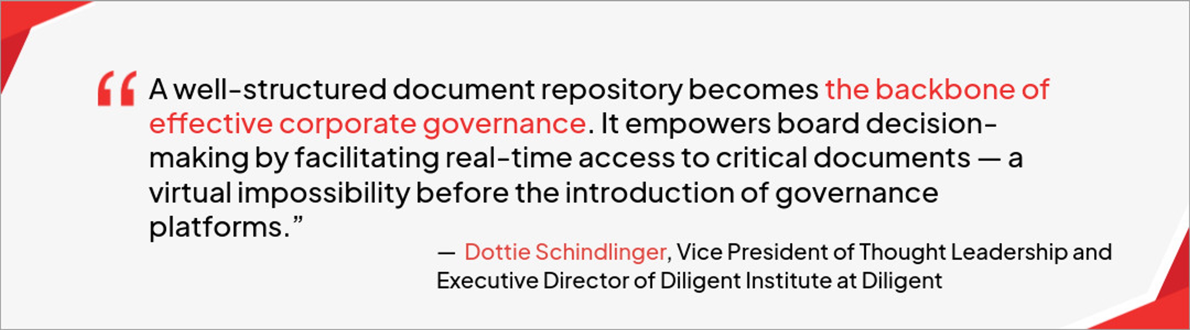 - Improve security and efficiency: With a document repository, you can place sensitive board materials and strategic documents behind layers of encryption, multi-factor authentication and role-based access controls to prevent unauthorized access.