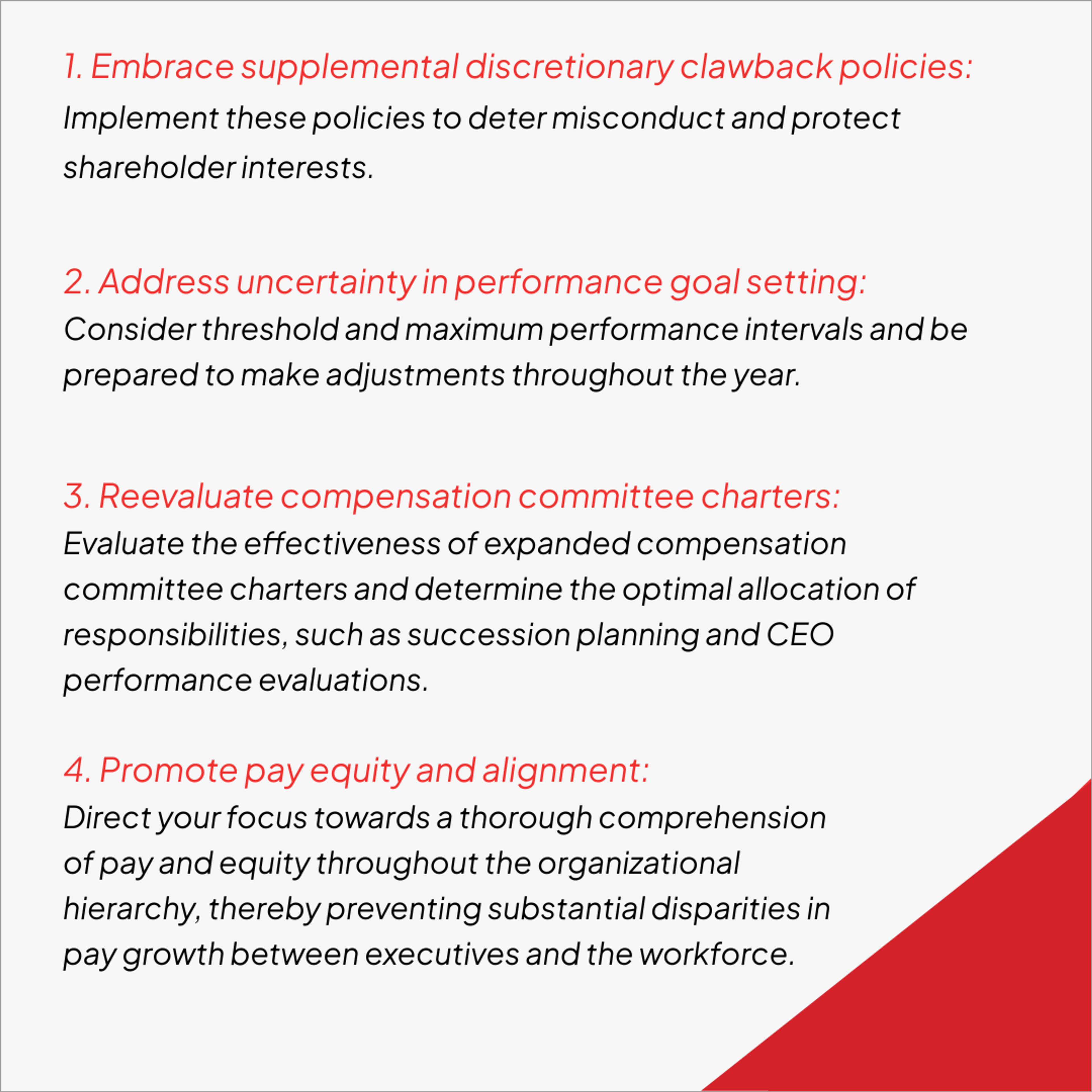Additionally, be prepared to adjust incentive plan performance goals throughout the year. Establishing guiding principles for evaluating potential adjustments is critical to ensure they are in the best interests of shareholders and the company.