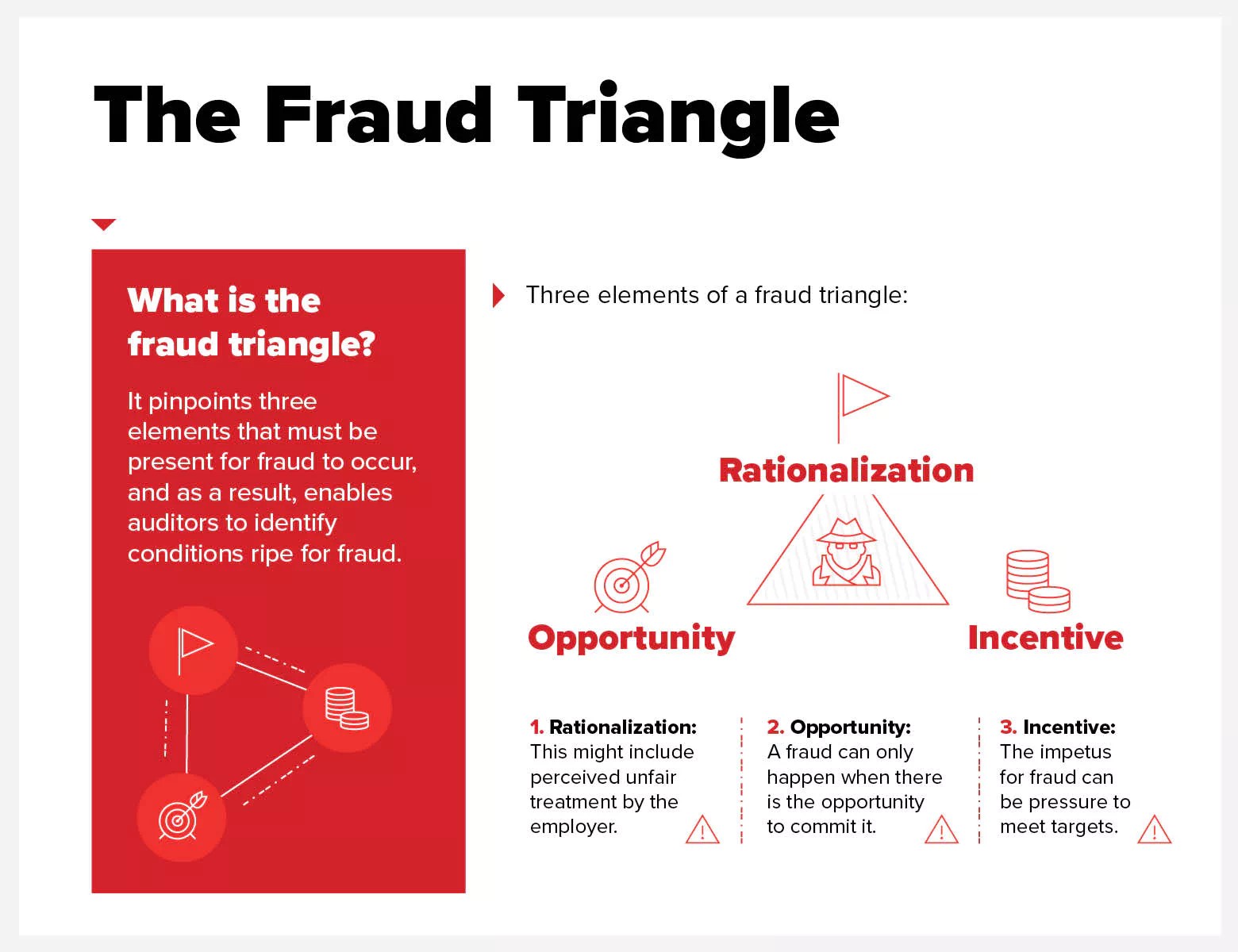 What is the fraud triangle? It pinpoints three elements that must be present for fraud to occur — and as a result, enables auditors to identify conditions ripe for fraud. The three elements are: