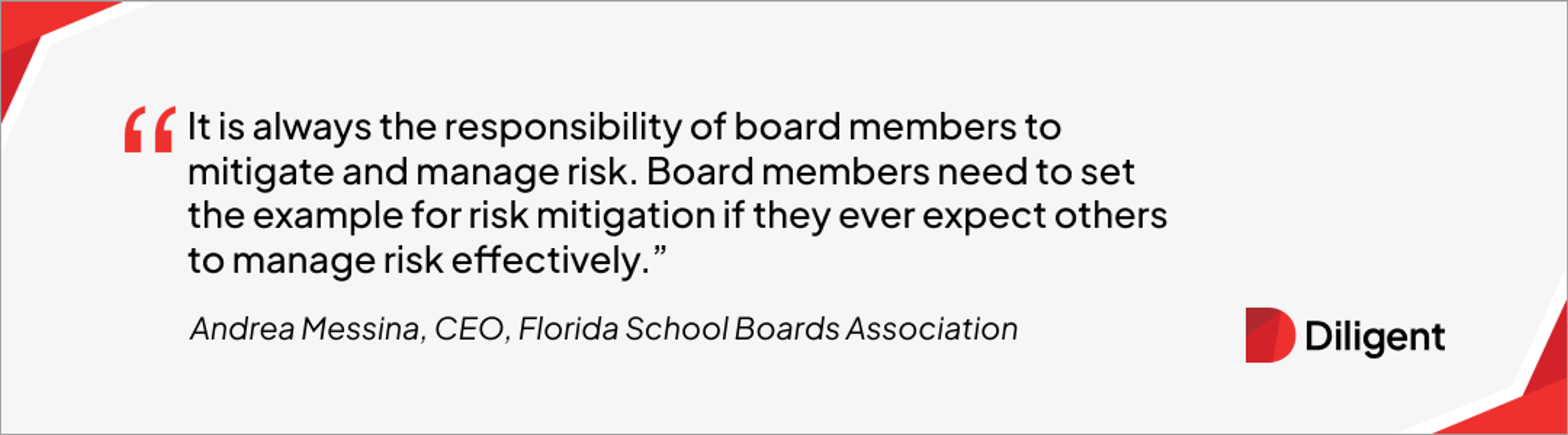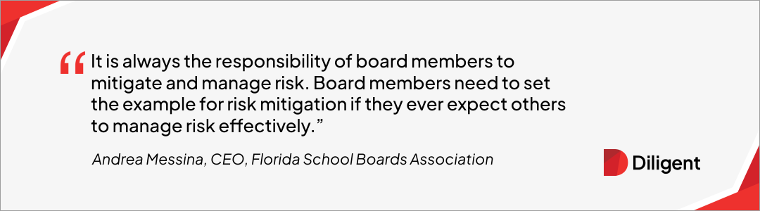 Andrea Messina, CEO, Florida School Boards Association says, “It is always the responsibility of board members to mitigate and manage risk. Sometimes, that comes in form or reporting to legal or HR something that may have been heard in passing or even deliberately shared with a board member. I like to remind board members that if they heard something and fail to report it and it happens again, they, too, now are culpable. Board members need to set the example for risk mitigation if they ever expect others to manage risk effectively.”