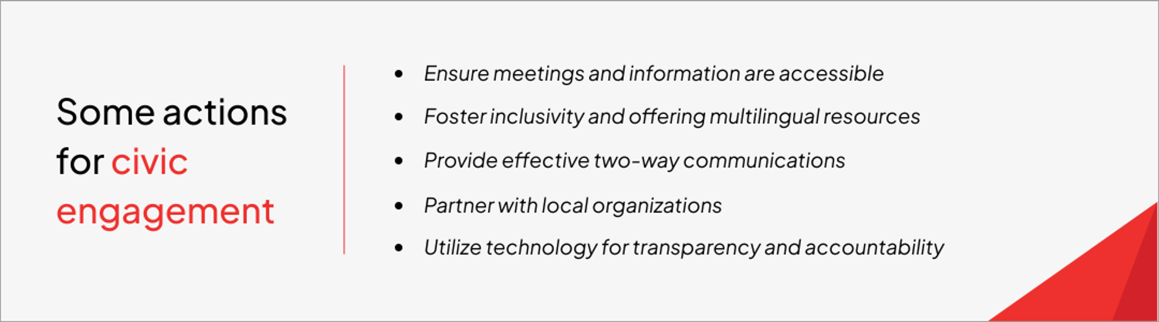 A more engaged citizenry will yield positive benefits such as greater public trust and transparency, better decision-making, economic advantages as well as improved public services and policies. Communities are also more likely to be united around common goals when citizens are fully engaged.