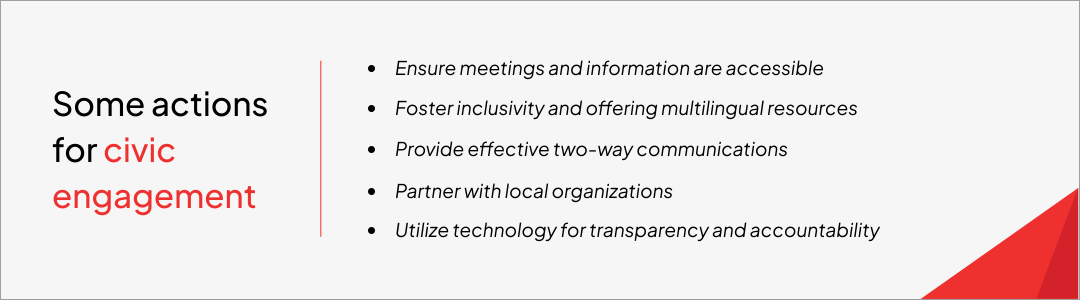 Municipalities need to take a proactive approach in actively engaging their citizens. To simply hope that every citizen will care and participate is not enough. Fortunately, there are many steps, through formal and informal channels, that local leaders can take to solicit engagement. These may include: