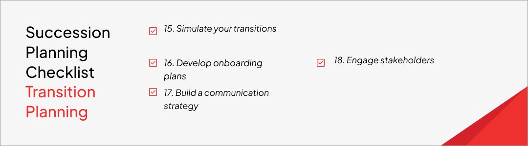 Key stakeholders in transition planning include investors, board members and employees. Conducting transparent succession processes makes stakeholders feel valued and builds their confidence in the integrity of the process.