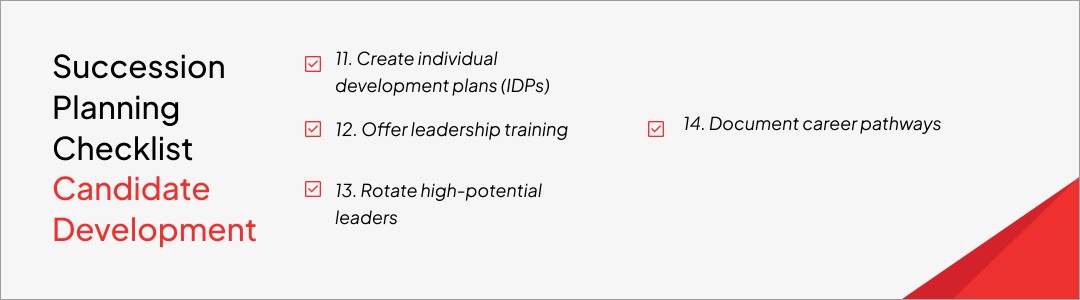 Identify training opportunities that could strengthen candidates’ capabilities. It’s important to remember that no candidate will have every skill or experience on your profile. However, tools like education and template libraries or connecting prospects with mentors and executive coaching can round out their skills.
